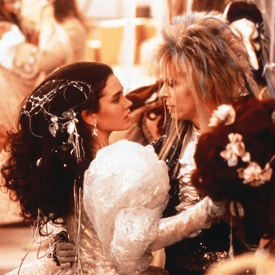 Pero si hay una escena que encapsula perfectamente esta estética es el inolvidable baile de máscaras entre Sarah y Jareth, el carismático e inquietante rey de los Goblins interpretado por David Bowie. Este momento, además de ser visualmente espectacular, tiene un aura tan mágica que una servidora no puede evitar admirarlo en todo su esplendor.
